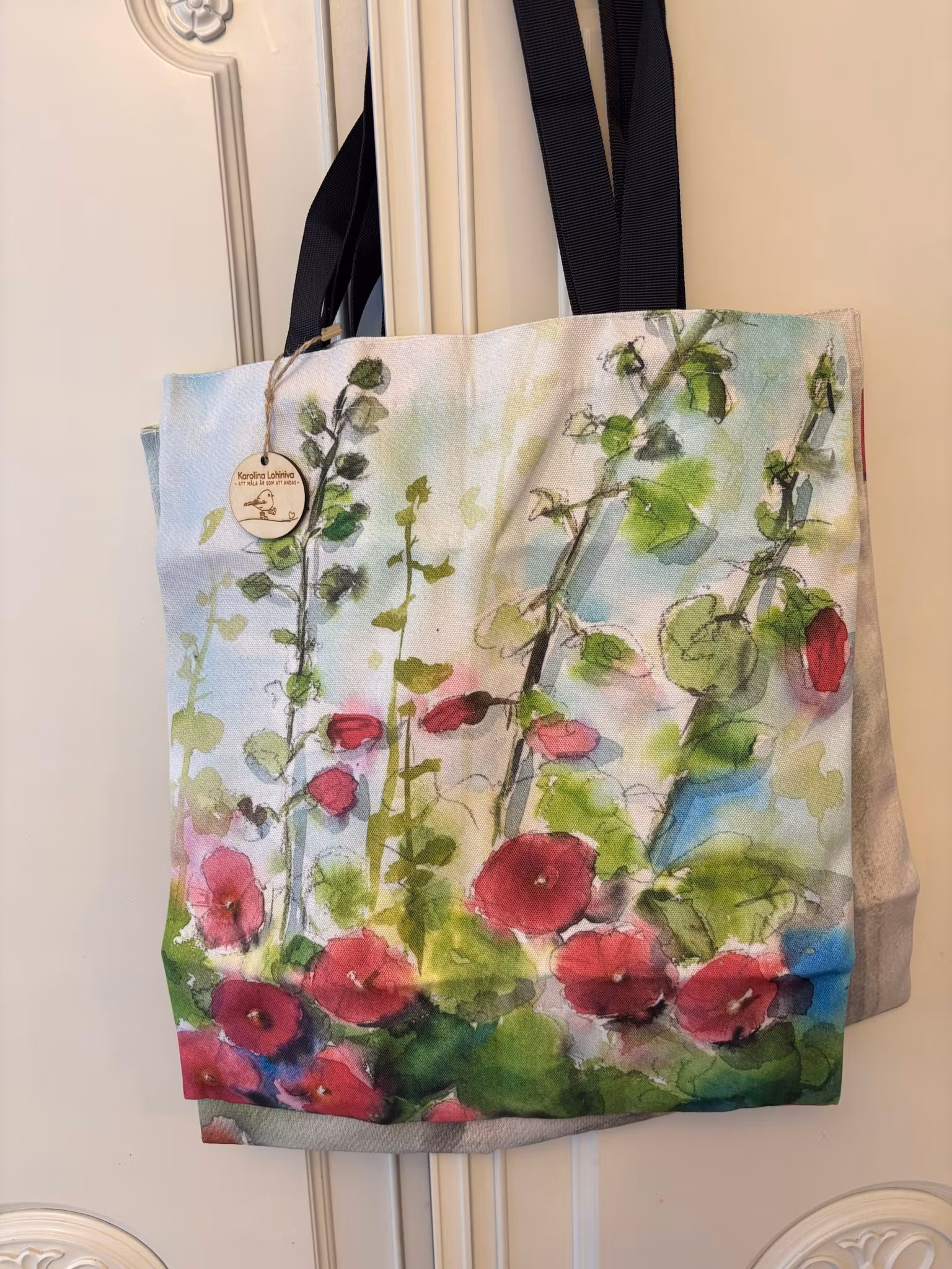 Stockros 250 kr Köp Information Recensioner Tygväska med motiv av Karolina Lohinivas akvarellmålning.Mått 34x40cm