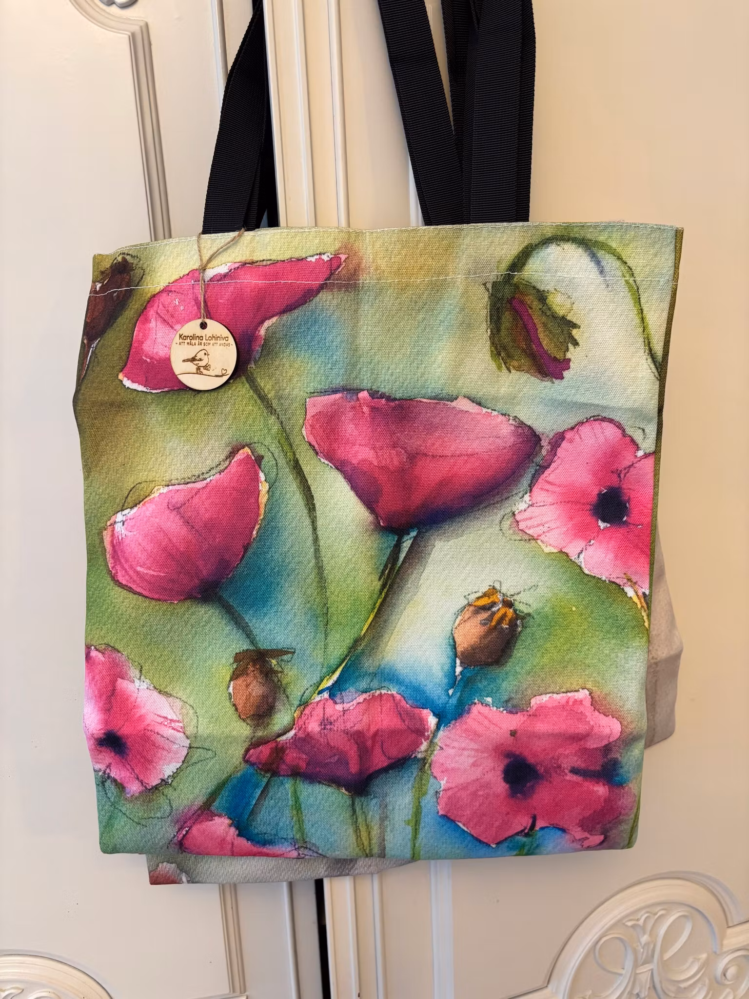 Rosa vallmo 250 kr Köp Information Recensioner Tygväska med motiv av Karolina Lohinivas akvarellmålning.Mått 34x40cm